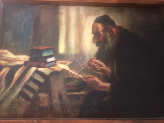 RG-14.25.01, Unknown Artist, A Rabbi Weaving the Fringe of a Tallit, 1956 | Los Angeles Museum of the Holocaust