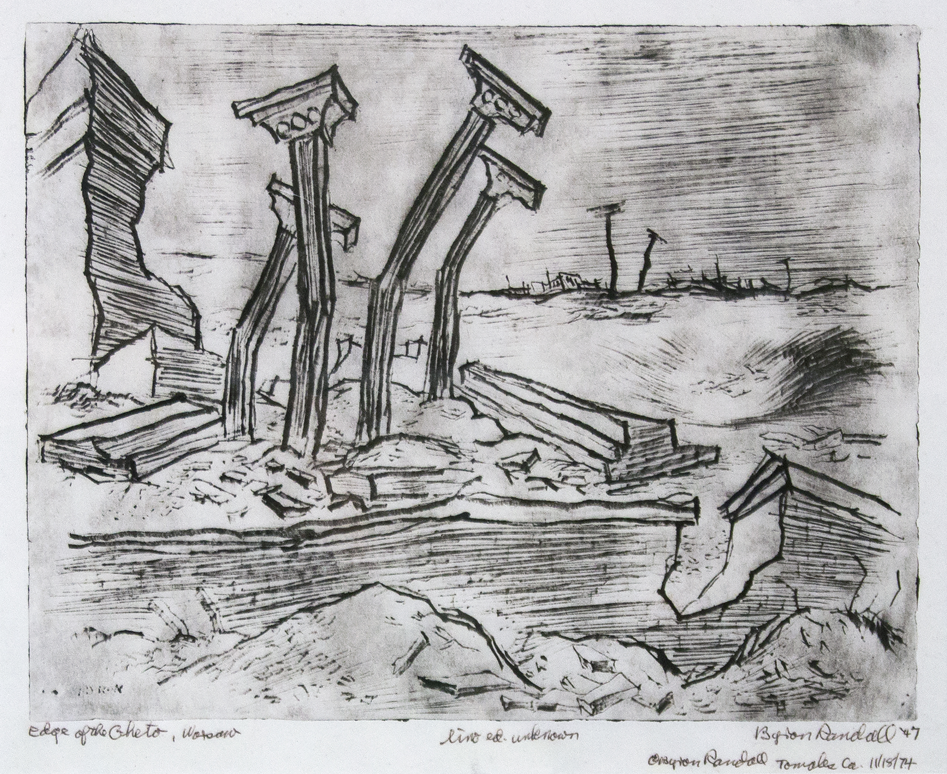 RG-14.21.01, Byron Randall, Edge of the Ghetto, Warsaw, Lino etching, 1947